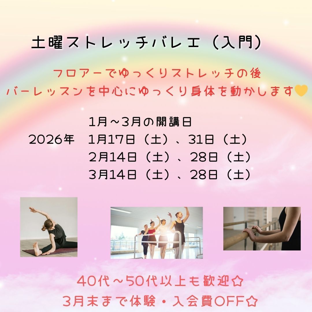 ◇年明けから、土曜ストレッチバレエ(入門)クラスをスタートいたします♪お気軽にお問合せください☆楽しいお仲間をお待ちしております♪